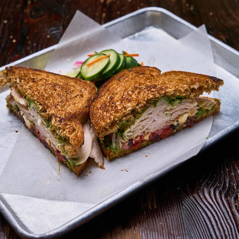 Oven-roasted turkey breast, sweet basil pesto, feta cheese, oven-roasted tomato, pickled red onion, spicy cranberry relish, grilled pumpernickel.