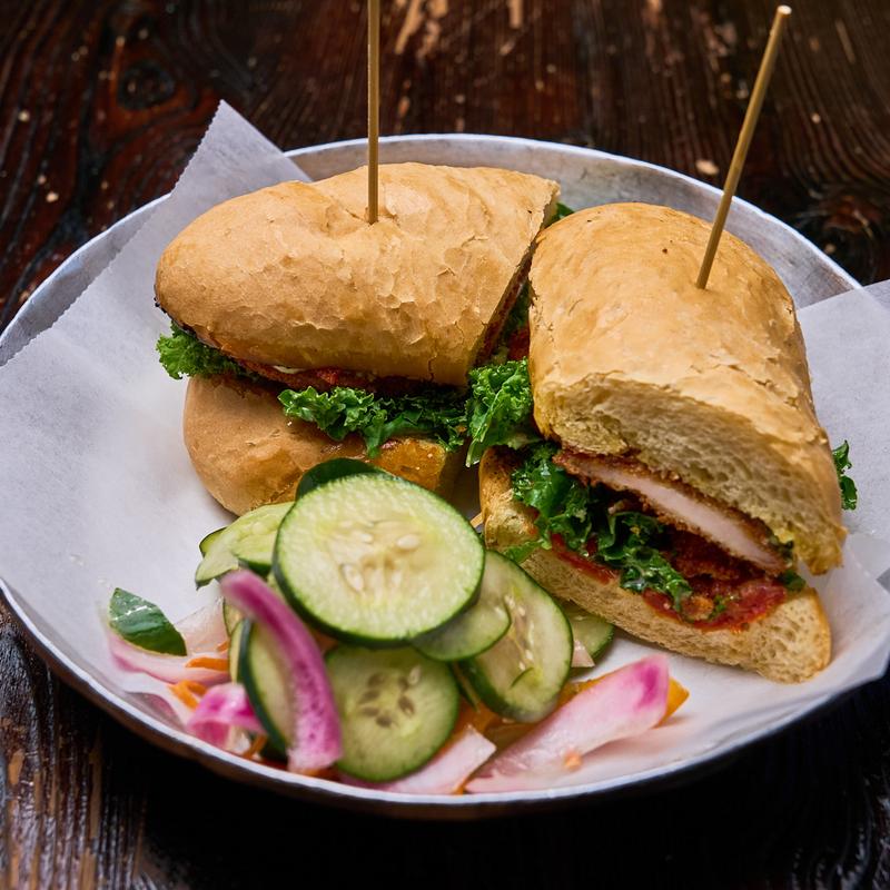 Breaded chicken cutlet, lemon kale, oven-dried tomatoes, garlic aioli, grilled local honey hoagie.